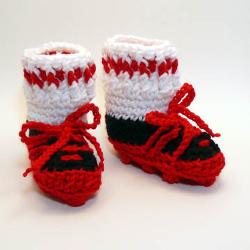 Presented here in black and red, these booties come complete with cleats on the soles and extra wide socks (could there be shin guards under those socks?) These can also be custom ordered in your favorite team’s colors.