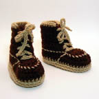 For those of you out in the wild, wild west who make your home on the range, these are the perfect little booties for your cowboy. Shown here in a warm brown and chocolate brown combination. These are also available in a baby blue and white combination. Lasso up a pair or two today. Yee haw!